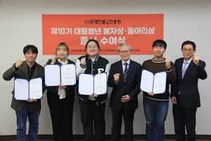 (재)대한불교진흥원(이사장 이한구)은 2025년 제10기 대원청년 불자상 ․ 동아리상 수상자와 수상단체를 선정하고 3월 12일 오후 2시 법인 사무실에서 증서 수여식과 함께 158건에 대한 총 3억6,900만 원의 장학 지원금을 전달했다.대원청년 불자상은 대학교 42명 대학원 12명 총54명으로 1인당 300만 원씩 1억6,200만 원이 지급됐다.대원청년 동아리상은 초등학교 1곳, 중학교 14곳, 고등학교 13곳, 대학교 71곳, 대학원 5곳 등 총104곳으로 2억700만 원이 지원됐다.대한불교진흥원은 청년불교 활성화 사업의 일환으