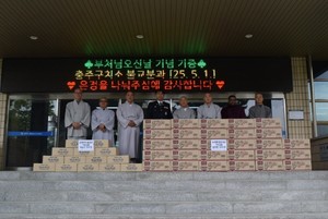 충주구치소 불교분과위원회(회장 지광 스님)는 부처님오신날을 앞두고 지난 5월 1일 충주구치소를 방문해 550인 분의 떡을 기부했다.이날 전달식에는 회장 지광 스님, 총무 일암 스님 등 5명의 분과위원이 참석했다.또 같은 날 녹색환경감시단도 충주구치소를 방문해 컵라면 550개를 전달했다. 전달식에는 이용범 총재와 권기백 사무총장 등 회원 5명이 함께 했다.-김종만 기자