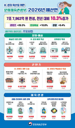 문화체육관광부(장관 최휘영, 이하 문체부) 2026년 예산안은 7조 7,962억 원으로 2025년 대비 10.3%(7,290억 원) 증가했다. 이는 2020년 이후 가장 큰 폭의 증가로, 이를 통해 ‘케이-컬처’의 성장을 가속화하고 국민들의 ‘케이-컬처’ 향유 기회를 더욱 확대할 것으로 기대된다.부문별로 살펴보면 문화예술 부문에 올해 예산 대비 2,564억 원이 증가한 2조 6,388억 원을, 콘텐츠 부문에 올해 예산 대비 26.5% 증가한 1조 6,103억 원을 편성했다. 관광 부문에는 9.4% 증가한 1조 4,740억 원을, 체