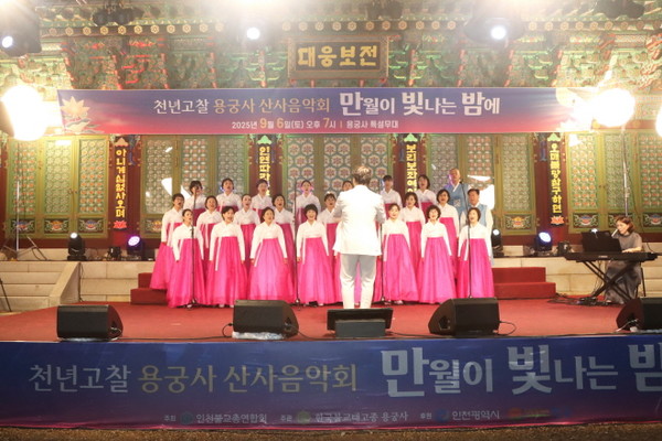 한국불교태고종 인천 용궁사(주지 능해 스님)는 9월 6일 오후 경내 대웅보전 앞 특설무대에서 ‘만월이 빛나는 밤에’란 주제로 산사음악회를 열고 불자 및 시민들과 함께 힐링의 시간을 가졌다.