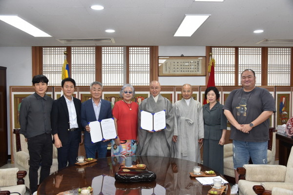 한국불교태고종 총무원(총무원장 상진 스님)은 9월 25일 오후 4시 한국불교전통문화전승관 2층 총무원장 집무실에서 사단법인 한국방송대중예술인단체연합회(이사장 유승봉, 이하 방예연)와 업무협약을 맺고〈사진〉 향후 문화교류를 폭넓게 전개해 나가기로 다짐했다.