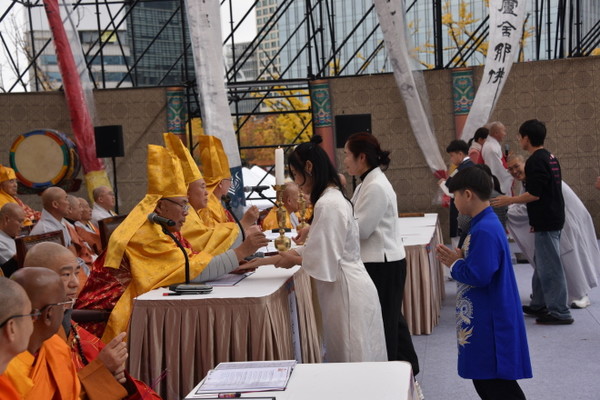 총무원 교무부장 정안 스님과 장선영 아나운서의 사회로 진행된 국제수계대법회는 전계아사리가 십선계를 내리고 참회와 연비의식으로 진행됐다. 전계아사리 수진 스님은 수계자 대표로 나온 신상도 중앙신도회 회장에게 수계증을 전달했다.