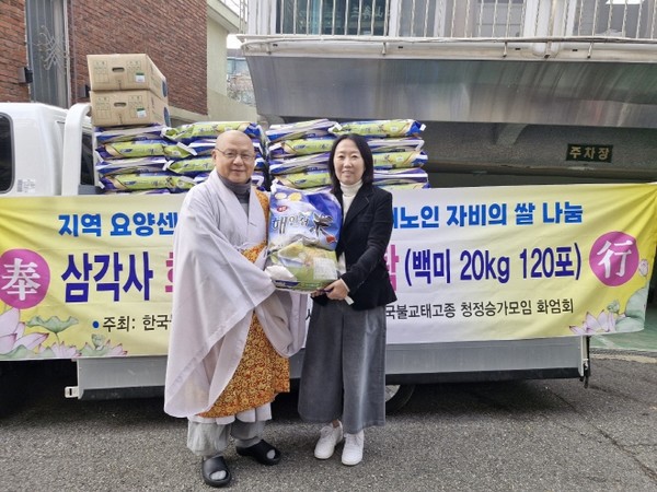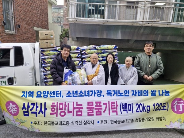 한국불교태고종 서울강북교구 종무원장 성해 스님(삼각사 주지)은 매년 실시해 온 자비의 쌀 나눔행사를 올해에도 지난 11월 20일 관내 지역 독거노인과 소년소녀 가정, 그리고 관내 요양센터에 백미 2천4백kg(20kg 120포)을 전달했다.〈사진〉